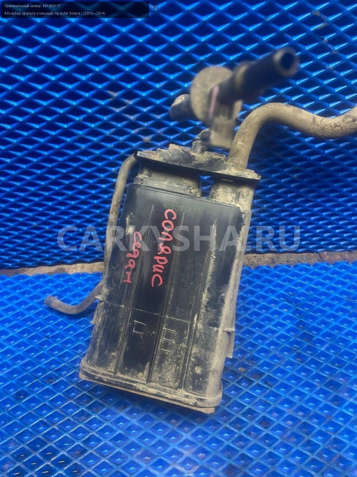 Hyundai Solaris I, Фильтр угольный.\nАртикул: 7671\n\nОриг. номер: 401090177\nПроизводитель: Hyundai-KIA\nПримечание:Хендай Солярис 1, фильтр угольный, бу. \n\nМарка: Hyundai\nМодель: Solaris I (2010—2014)\nГод выпуска: 2014\nКузов тип: Седан\nДвигатель номер: G4FC\nМодель двигателя: инжектор\nОбъем: 1.6\nТопливо: Бензин\nКоробка: Механика\nЦвет: Черный\nСовместимости: Hyundai Solaris I (2010—2014) 1.6 MT (123 л.с.)\nСовместимость: