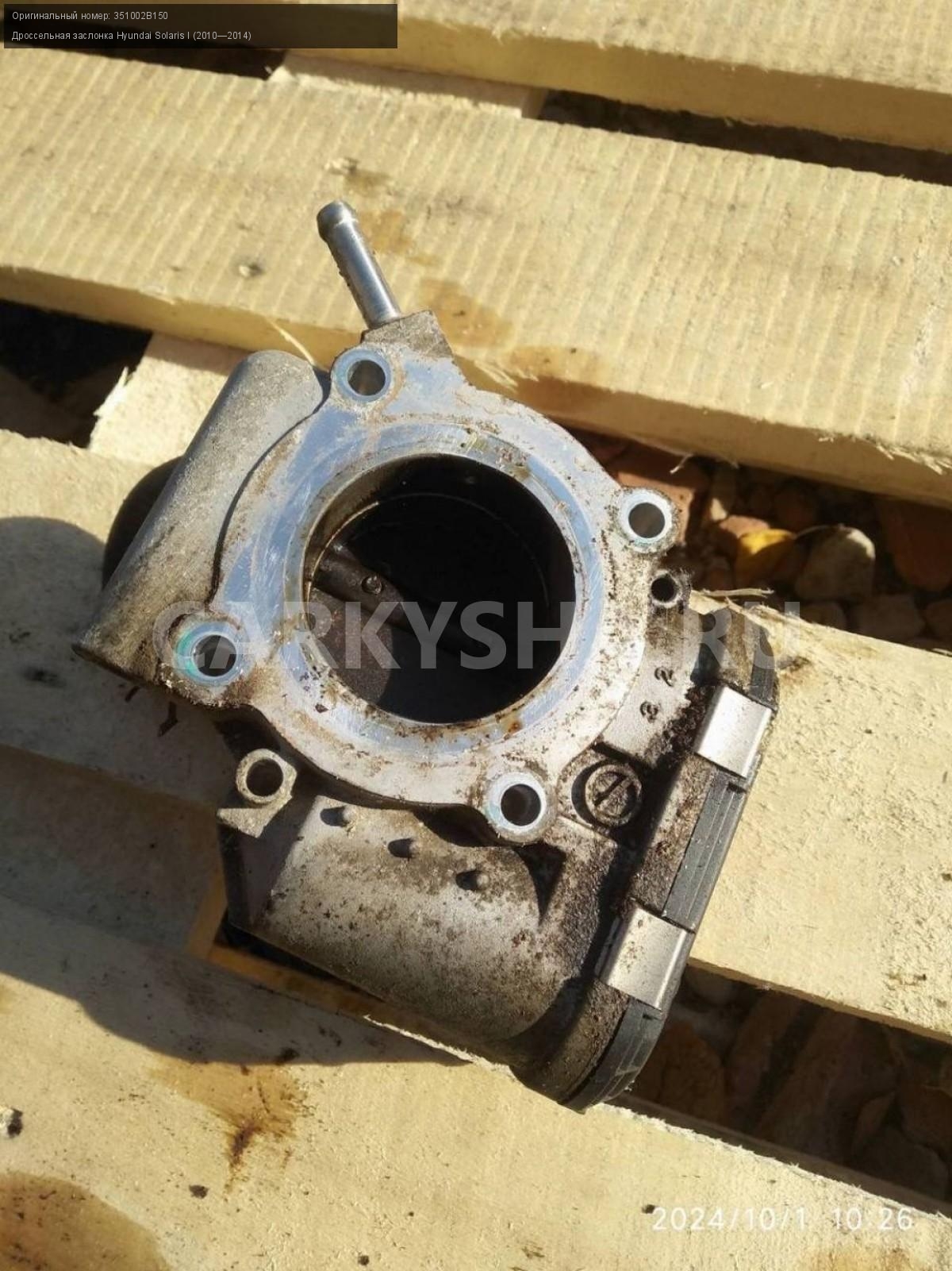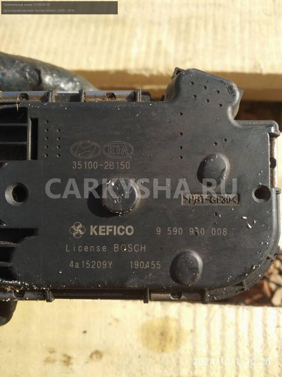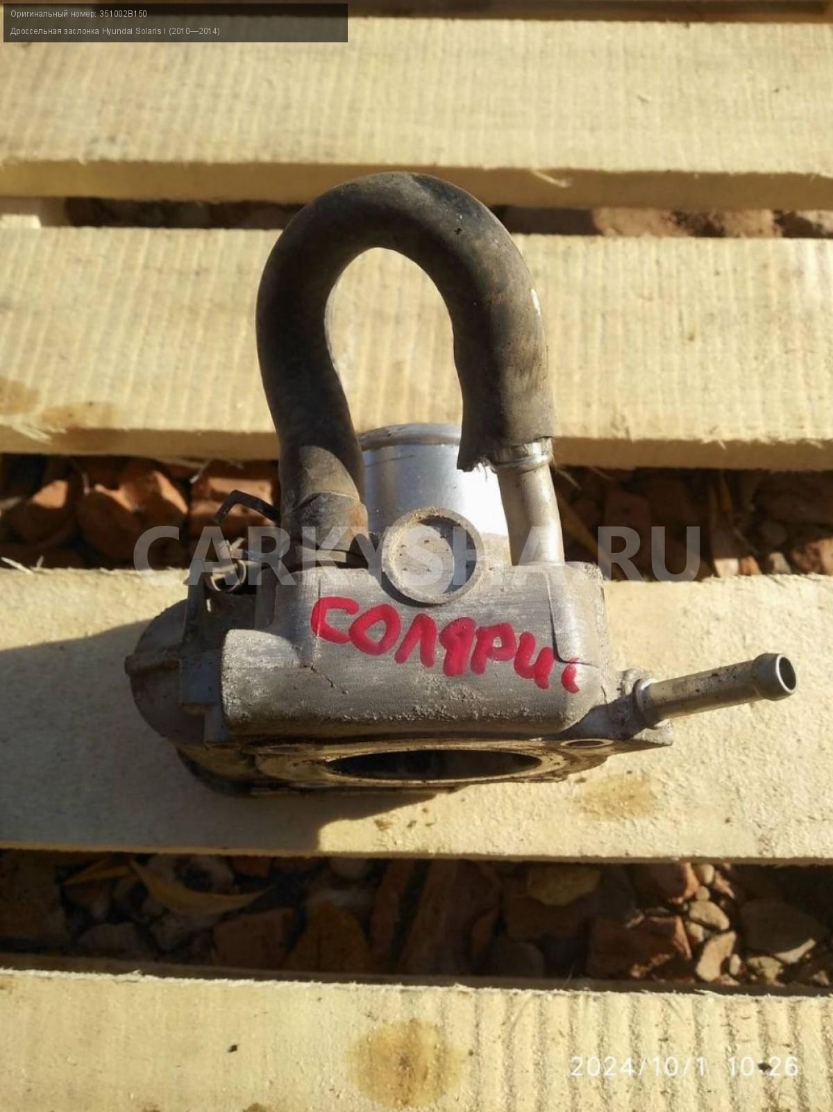 Hyundai Solaris I, дроссельная заслонка.\nАртикул: 5836\n\nОриг. номер: 351002B150\nПроизводитель: Hyundai-KIA\nПримечание:Хендай Солярис 1, дроссельная заслонка, б/у. \n\nМарка: Hyundai\nМодель: Solaris I (2010—2014)\nГод выпуска: 2012\nКузов тип: Седан\nДвигатель номер: G4FA\nМодель двигателя: инжектор\nОбъем: 1.4\nТопливо: Бензин\nКоробка: Механика\nЦвет: Черный\nСовместимости: Hyundai Solaris I (2010—2014) 1.4 MT (107 л.с.)\nСовместимость: