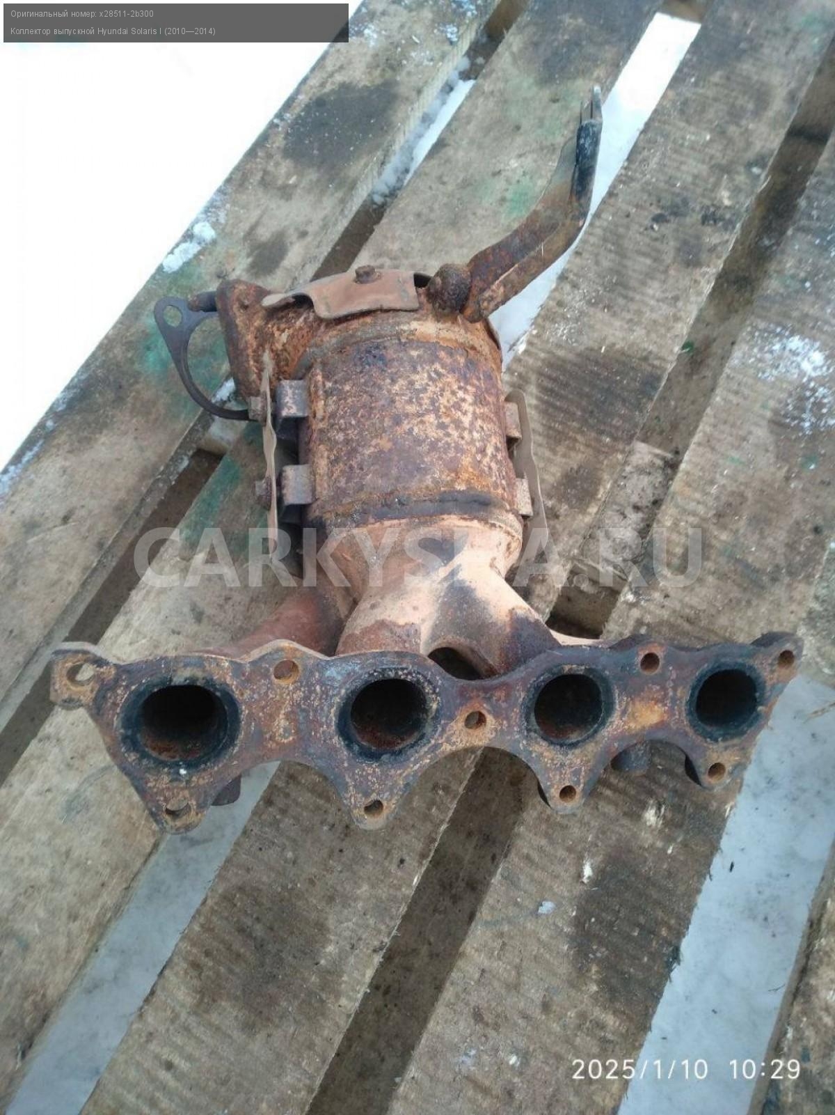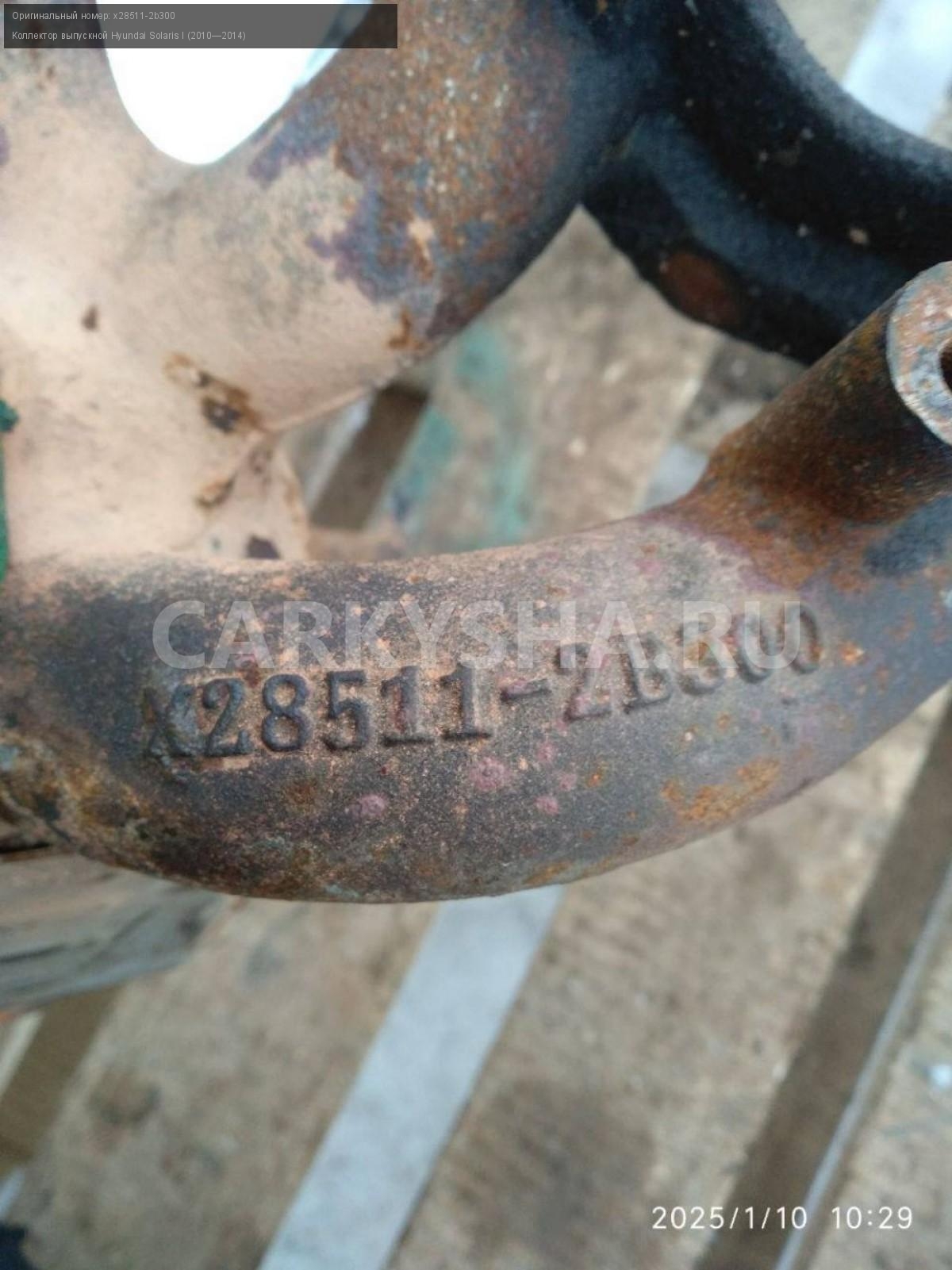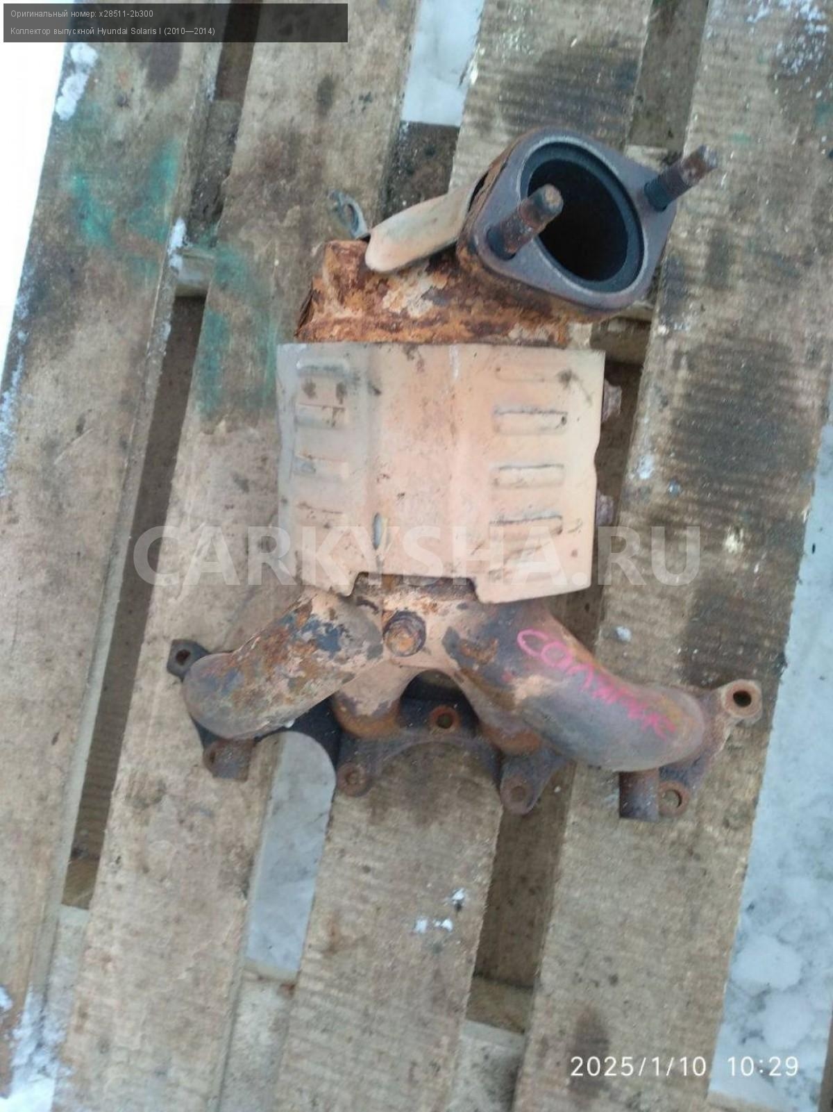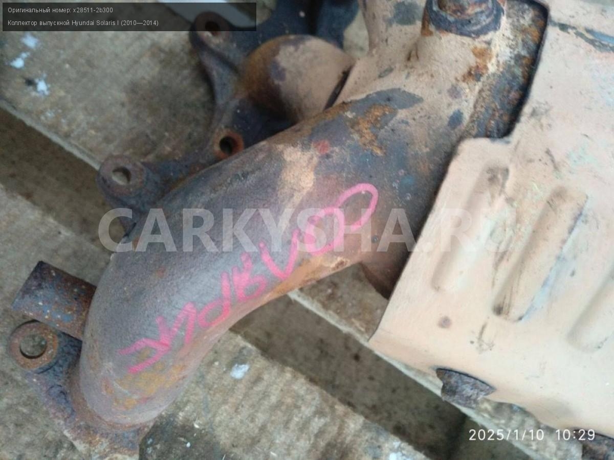 Hyundai Solaris I, коллектор выпускной.\nАртикул: 6663\n\nОриг. номер: x28511-2b300\nПроизводитель: Hyundai-KIA\nПримечание:Хендай Солярис 1 коллектор выпускной без катализатора , б/у. \n\nМарка: Hyundai\nМодель: Solaris I (2010—2014)\nГод выпуска: 2012\nКузов тип: Седан\nДвигатель номер: G4FA\nМодель двигателя: инжектор\nОбъем: 1.4\nТопливо: Бензин\nКоробка: Механика\nЦвет: Черный\nСовместимости: Hyundai Solaris I (2010—2014) 1.4 MT (107 л.с.)\nСовместимость: