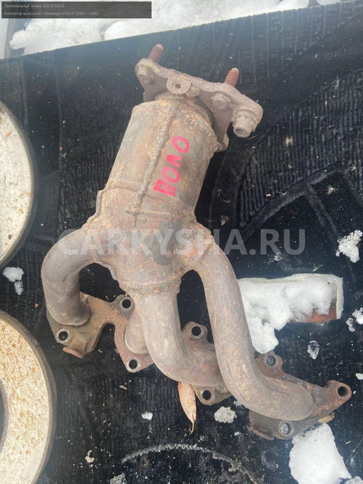 Volkswagen Polo IV, 1,4 коллектор выпускной.\nАртикул: 3662\n\nОриг. номер: 03C253031E\nПроизводитель: VOLKSWAGEN\nПримечание:Фольцваген Поло 4, 1,4 коллектор выпускной без катализатора, б/у. \n\nМарка: Volkswagen\nМодель: Polo IV (2001—2005)\nГод выпуска: 2002\nКузов тип: Хетчбэк\nДвигатель номер: BBY\nМодель двигателя: инжектор\nОбъем: 1.4\nТопливо: Бензин\nКоробка: Автомат\nЦвет: Синий\nСовместимости: Volkswagen Polo IV (2001—2005) 1.4 AT (75 л.с.)\nСовместимость: